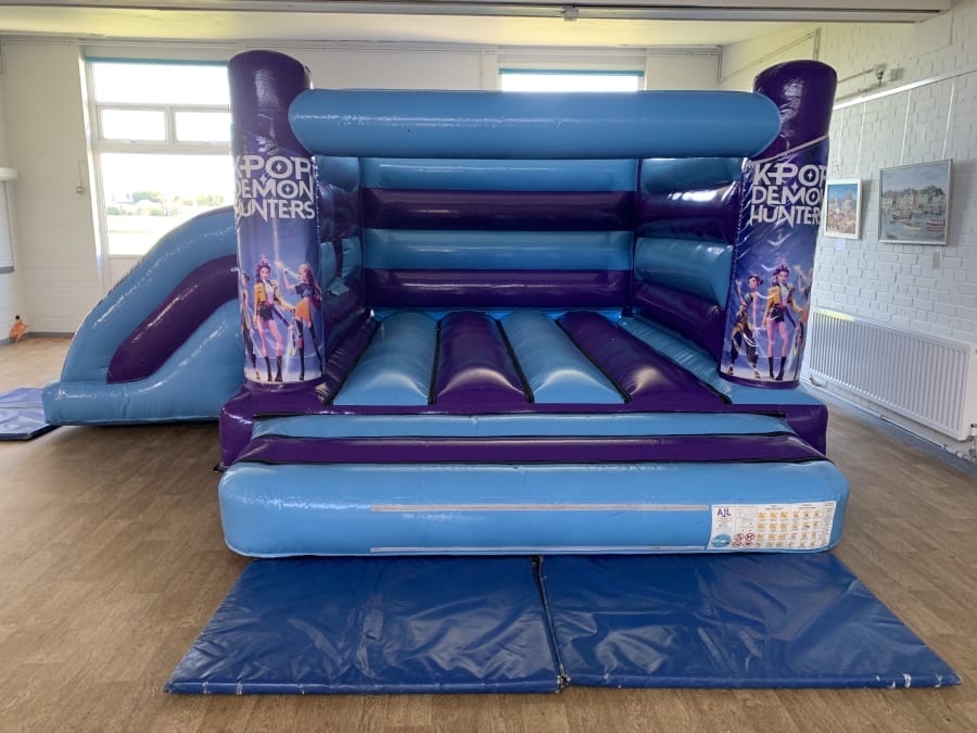 17ft x 15ft K Pop bouncy castle combo hire delivering to areas in Littlehampton, Worthing, Brighton & Hove, Horsham, burgess hill, West Sussex. This K-pop demon hunters bouncy castle combo delivers high-energy fun, vivid themed graphics and safe play for children. The spacious 17ft x 15ft layout combines a large bounce area with a side-slide for added fun, perfect for birthdays, school fairs and community events.